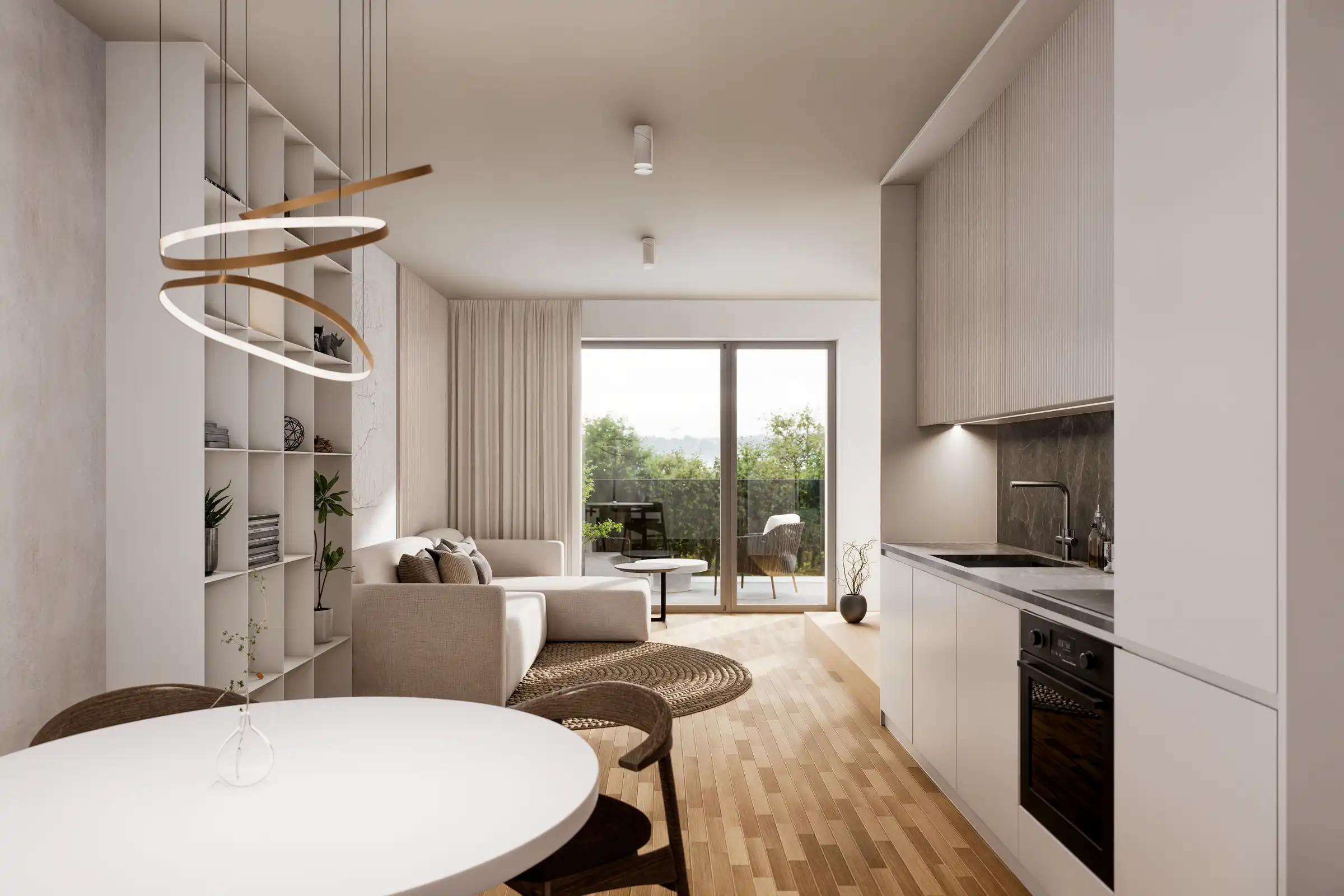 Interiéry jsou navrženy v duchu minimalismu a nadčasové estetiky. Kombinace světlých tónů, dřeva a kvalitních materiálů vytváří vzdušný, útulný a elegantní domov, kde každý detail dává smysl.